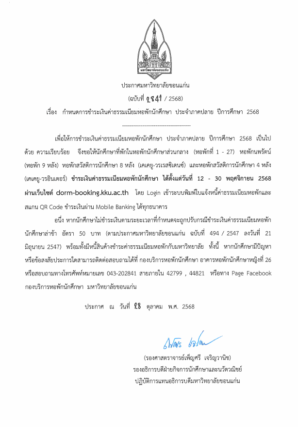 💰 ชำระค่าธรรมเนียมหอพักนักศึกษา ได้ตั้งแต่วันที่ 12 – 30 พฤษจิกายน 2568 ผ่านเว็บไซต์ https://dorm-booking.kku.ac.th